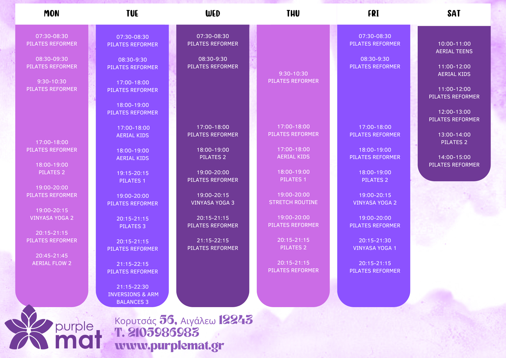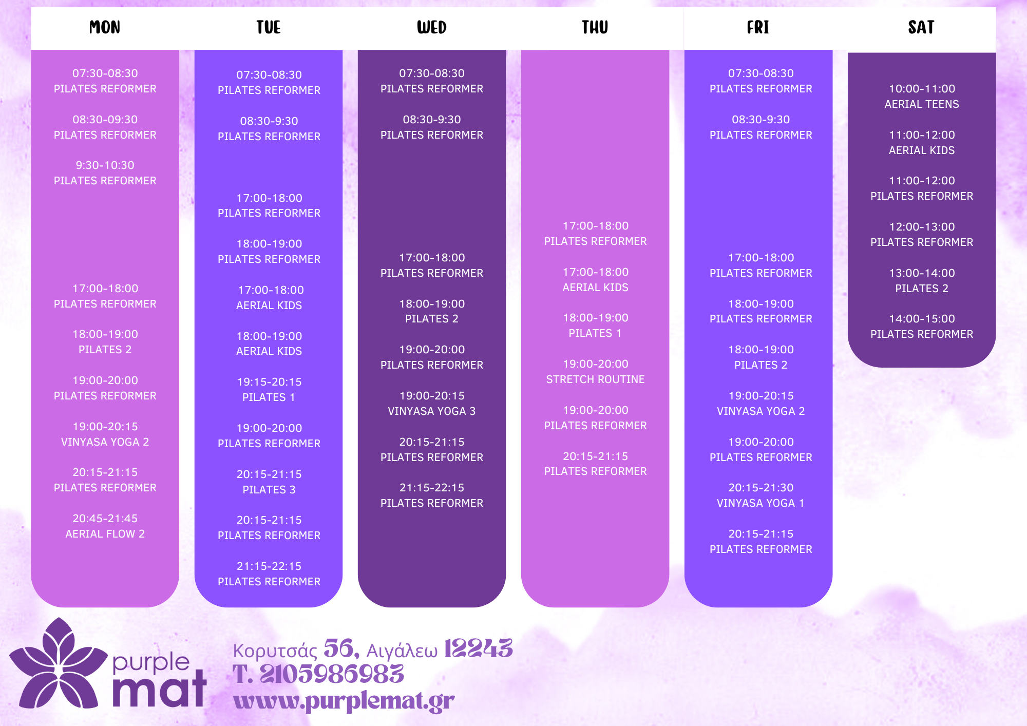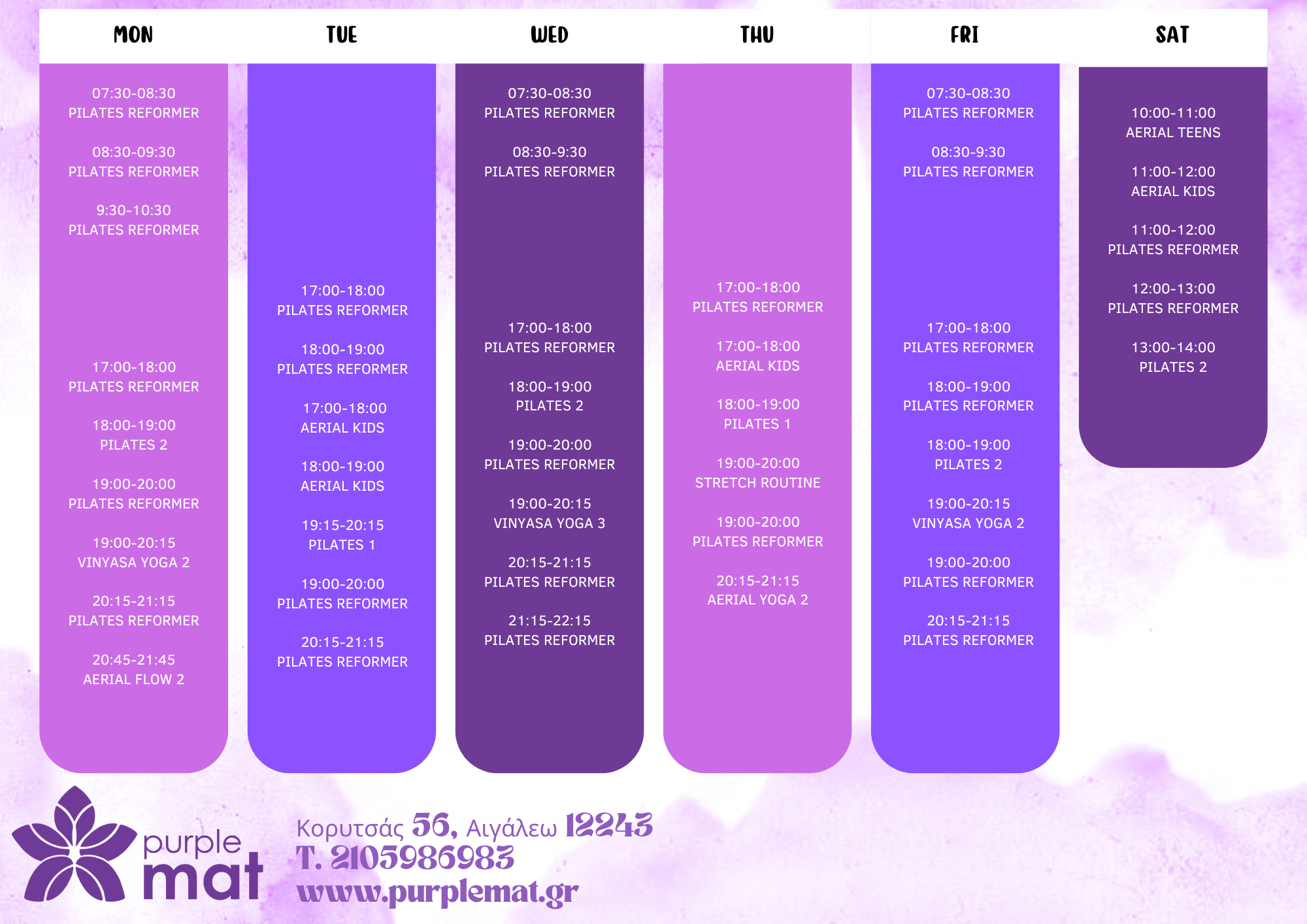 Εβδομαδιαίο πρόγραμμα μαθημάτων στον χώρο του Purple Mat στο Αιγάλεω